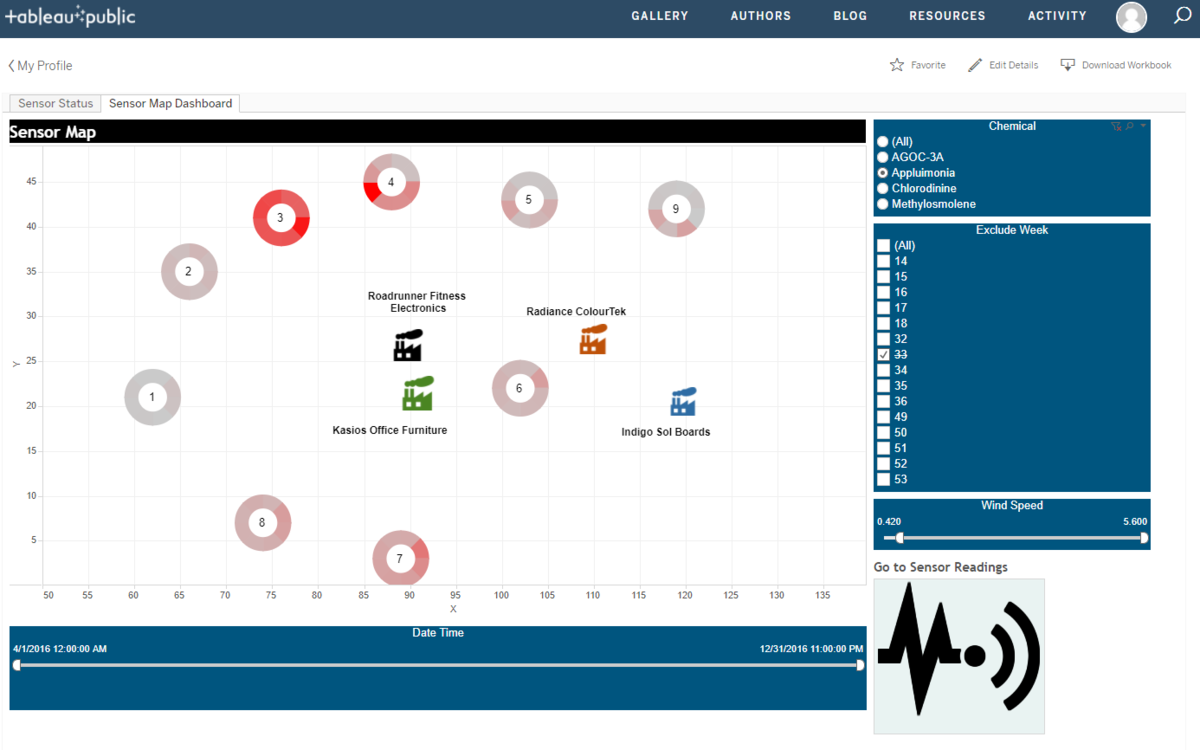 In fact, Mitch was surprised to learn that the factories had recently taken steps to make their processes more environmentally friendly, even though it raised their cost of production. Mitch discovered that the state government has been monitoring the gaseous effluents from the factories through a set of sensors, distributed around the factories, and set between the smokestacks, the city of Mistford and the nature preserve. The state has given Mitch access to their air sampler data, meteorological data, and locations map. Mitch is very good in Excel, but he knows that there are better tools for data discovery, and he knows that you are very clever at visual analytics and would be able to help perform an analysis.
